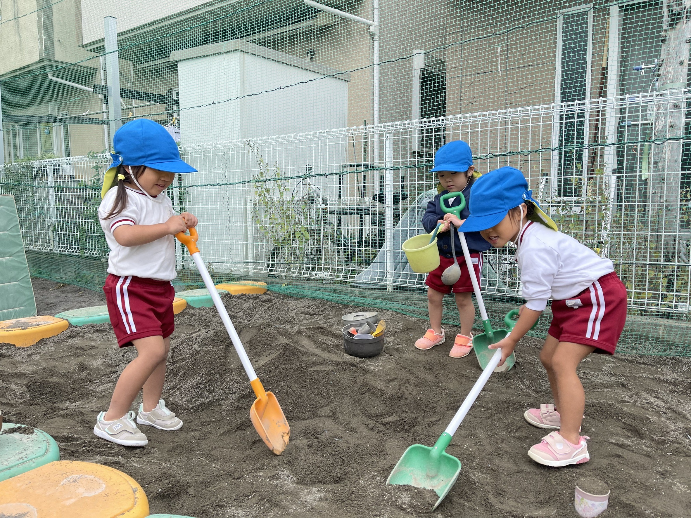 10/24 お外で遊ぶの楽しいな♡ 長かった暑い日がやっと終わり、思いっきり外で遊べるようになりました!以前は個々で遊んでいたポピー組のみんなですが、最近はお友達と遊びたい気持ちが芽生えてきた様子です♪役割を決めおままごとをしたり、協力してお山を作ったり!(^^)!これからもっと遊びの幅が広がりそうですね!