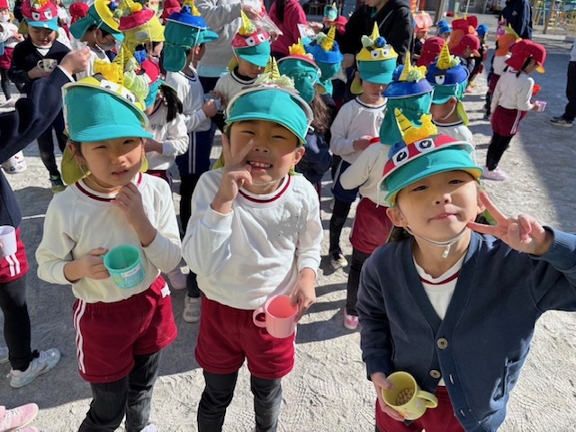 02/02 豆まき 明日は節分です。子どもたちは、元気に豆まきをしました。先生たちが鬼になって逃げてくれて「鬼は外!」と鬼退治を楽しんだ子供たちでした。子どもたちが作ったお面もカラフルでかわいかったですよ~