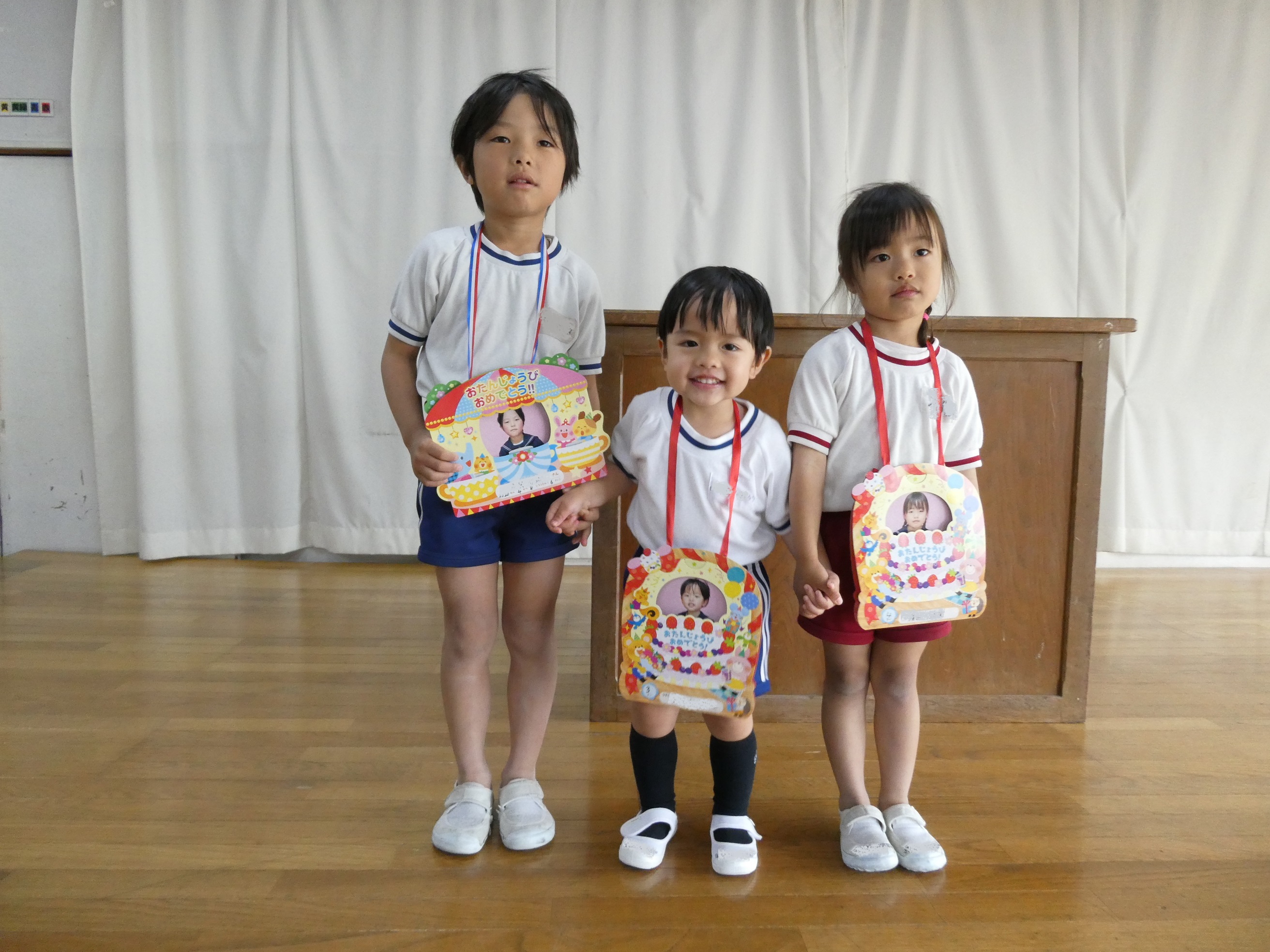 04/22 4月生まれお誕生会☆ 毎月お誕生日の子をお祝いして、お誕生会が行われます♪今日は4月生まれのお祝いをしました!みんなでお歌のプレゼントと「おめでとう!」を元気いっぱい言いましたよ。先生からは、素敵なプレゼントをもらい少し恥ずかしそうにしながらも、嬉しそうでした♡みんなのお誕生日も楽しみだね(*^_^*)