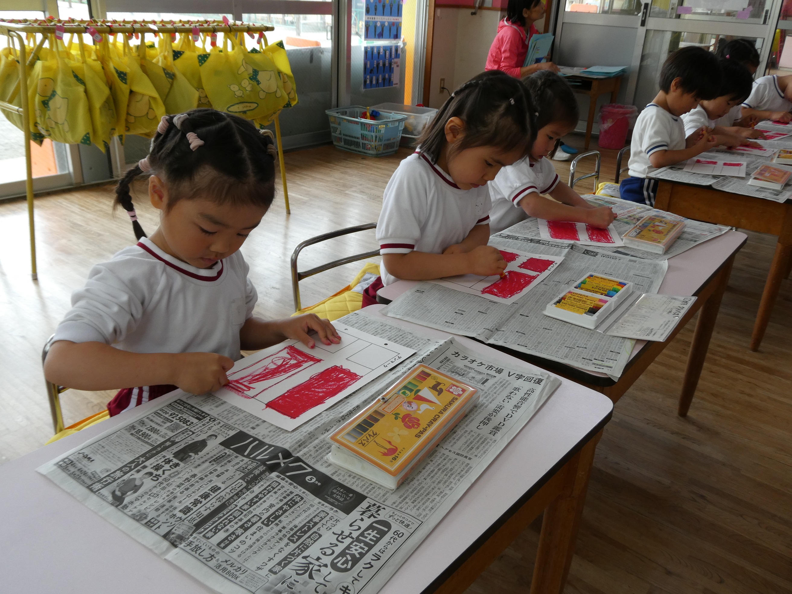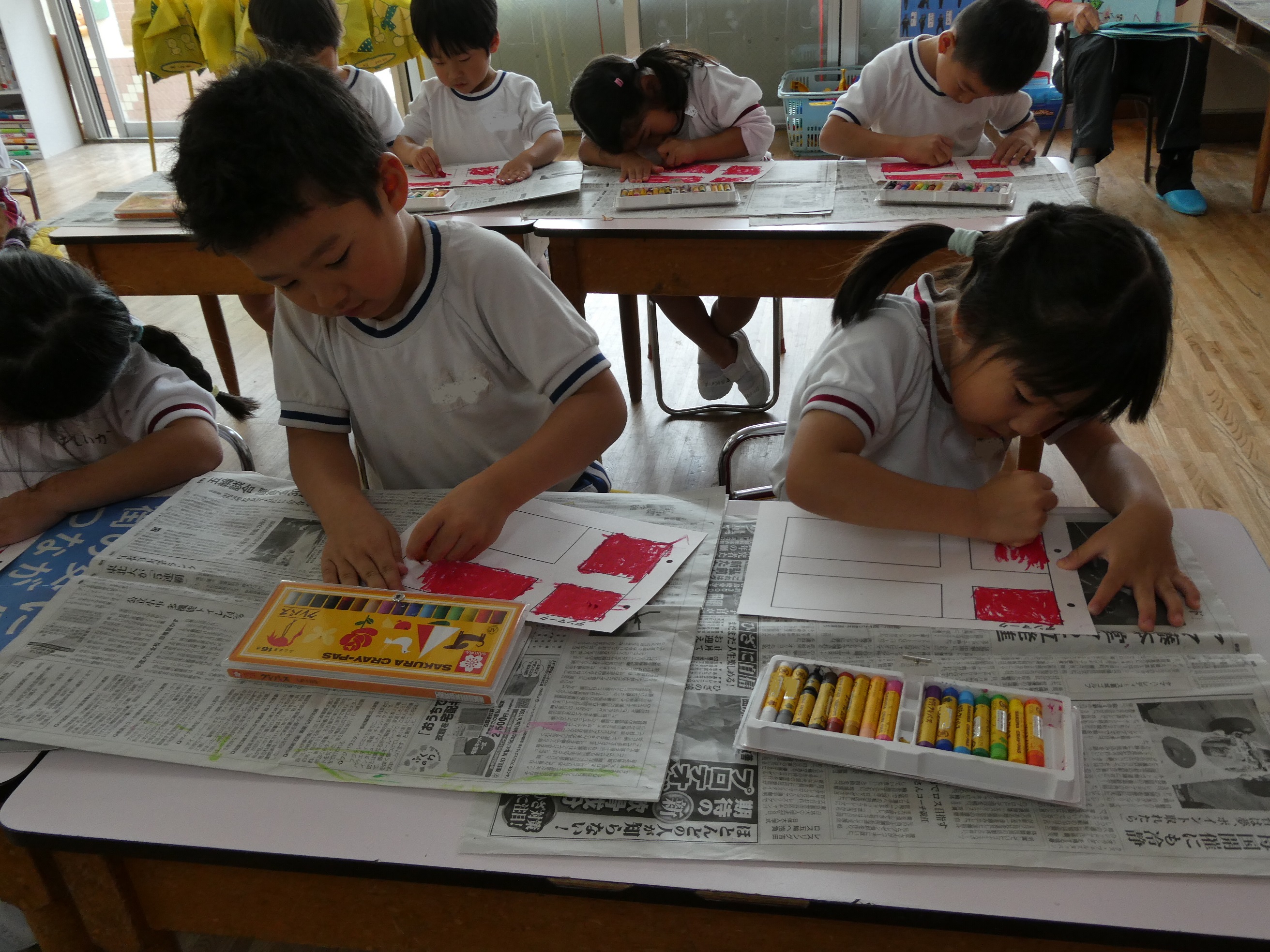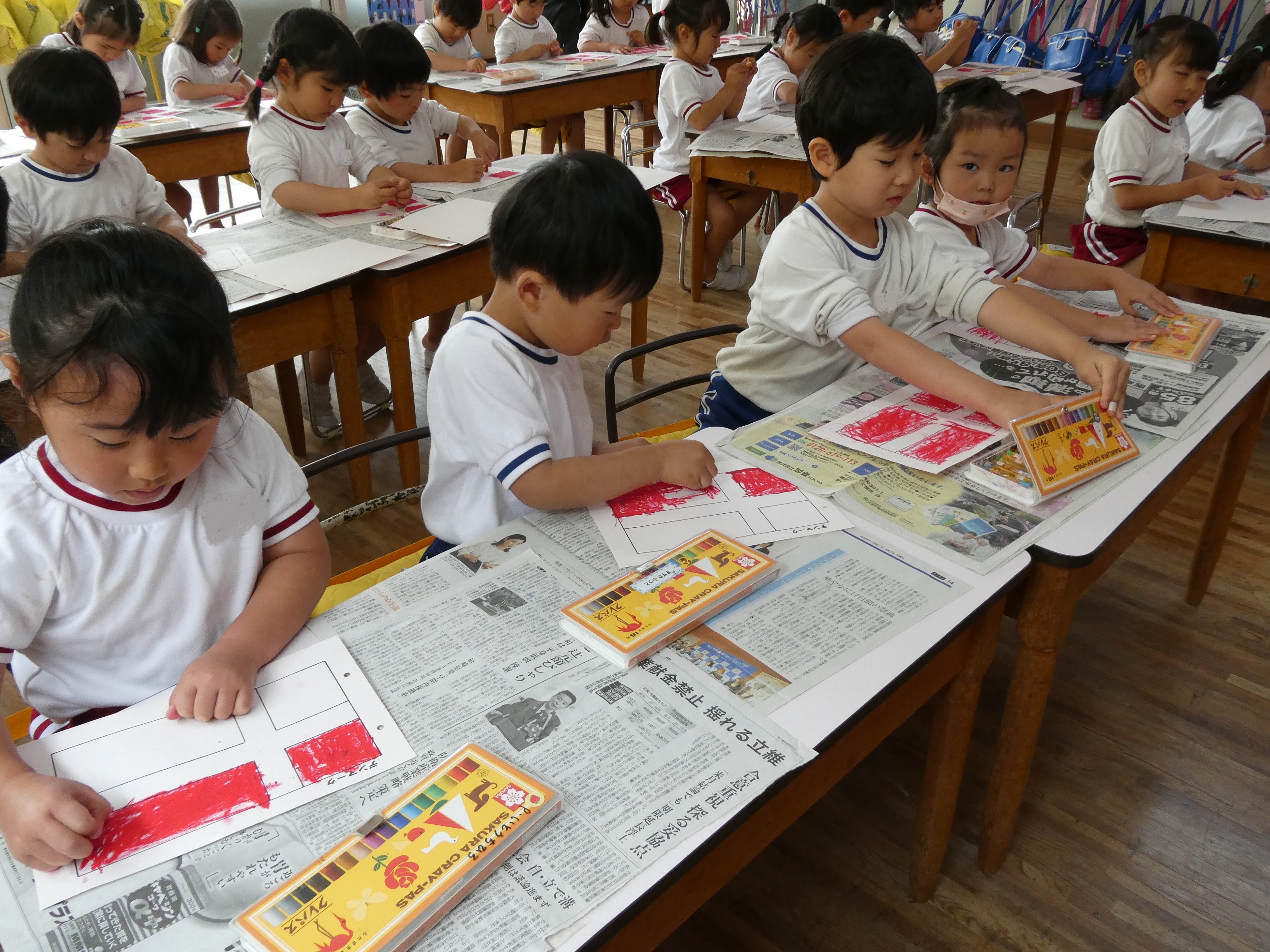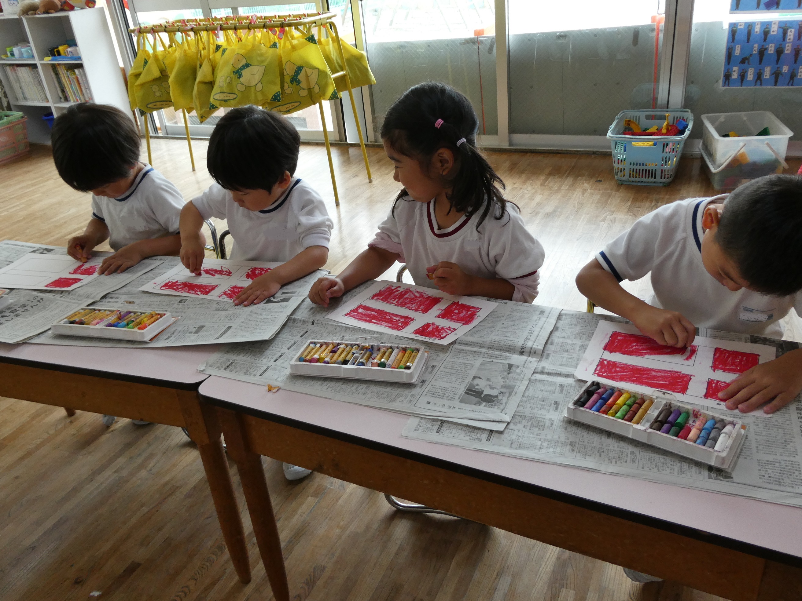 04/24 ぬたくり遊び『国旗』 国旗の色をクレパスを使って塗る、ぬたくり遊びを行いました。色彩感覚を養ったり、さまざまな色に触れ想像力を膨らませることができたり、集中力が増したたり…子どもたちの成長にかかせない活動になります♪きれいに塗れると、達成感を味わうことができ、子どもたちの自信につながっていきます☆