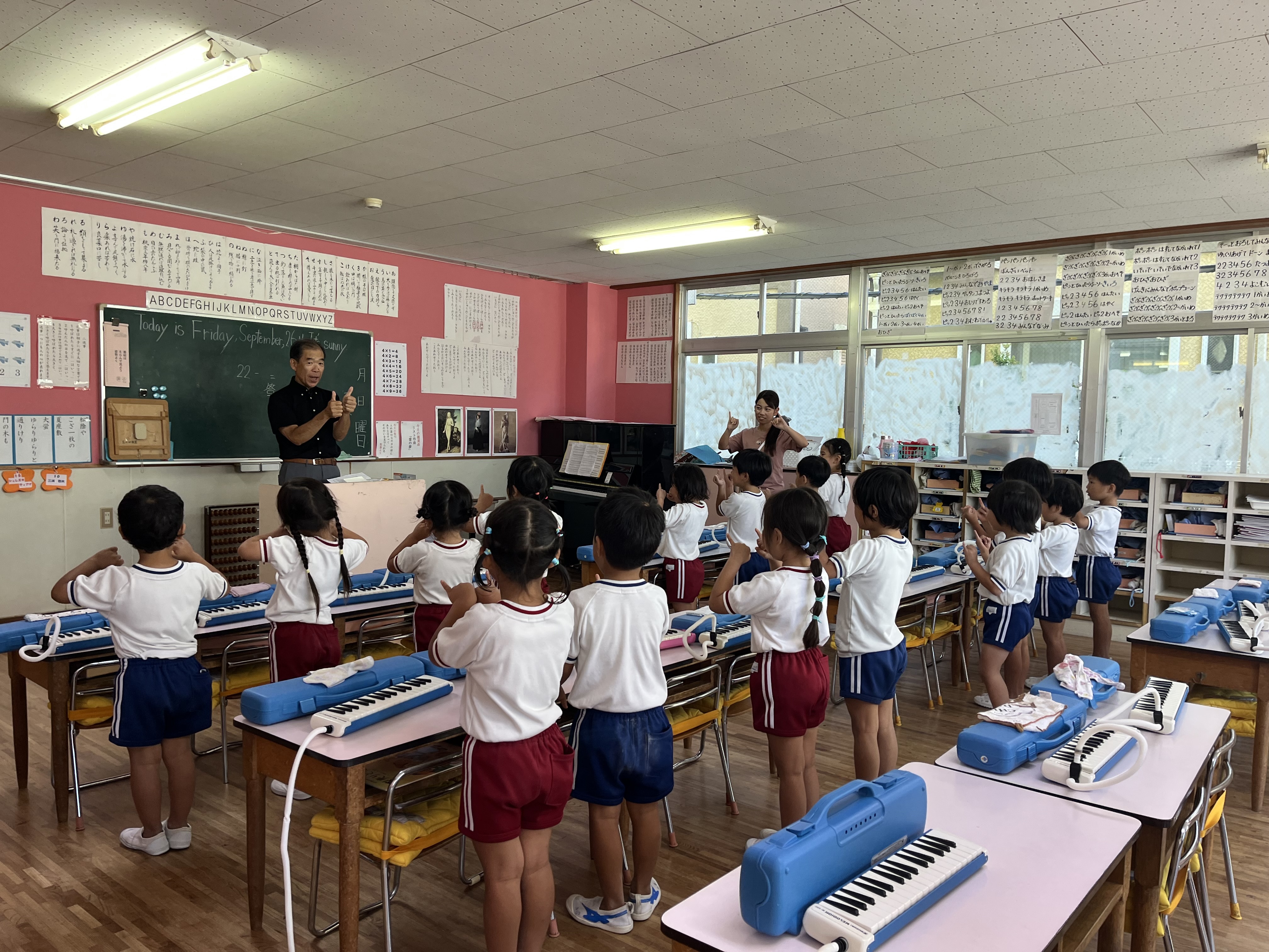 09/26 音楽指導 今日は音楽指導の日です。花乃幼稚園の子どもたちは歌が大好きなので、いつもこの時間を楽しみにしています。始まりの挨拶から、姿勢や口の開け方に気を付け集中して始まり、先生のご指導で歌にさらに抑揚がつき、子どもたちはとても楽しそう!メロディオンも日に日に上達し、子どもたちの自信になっています(*^^)v