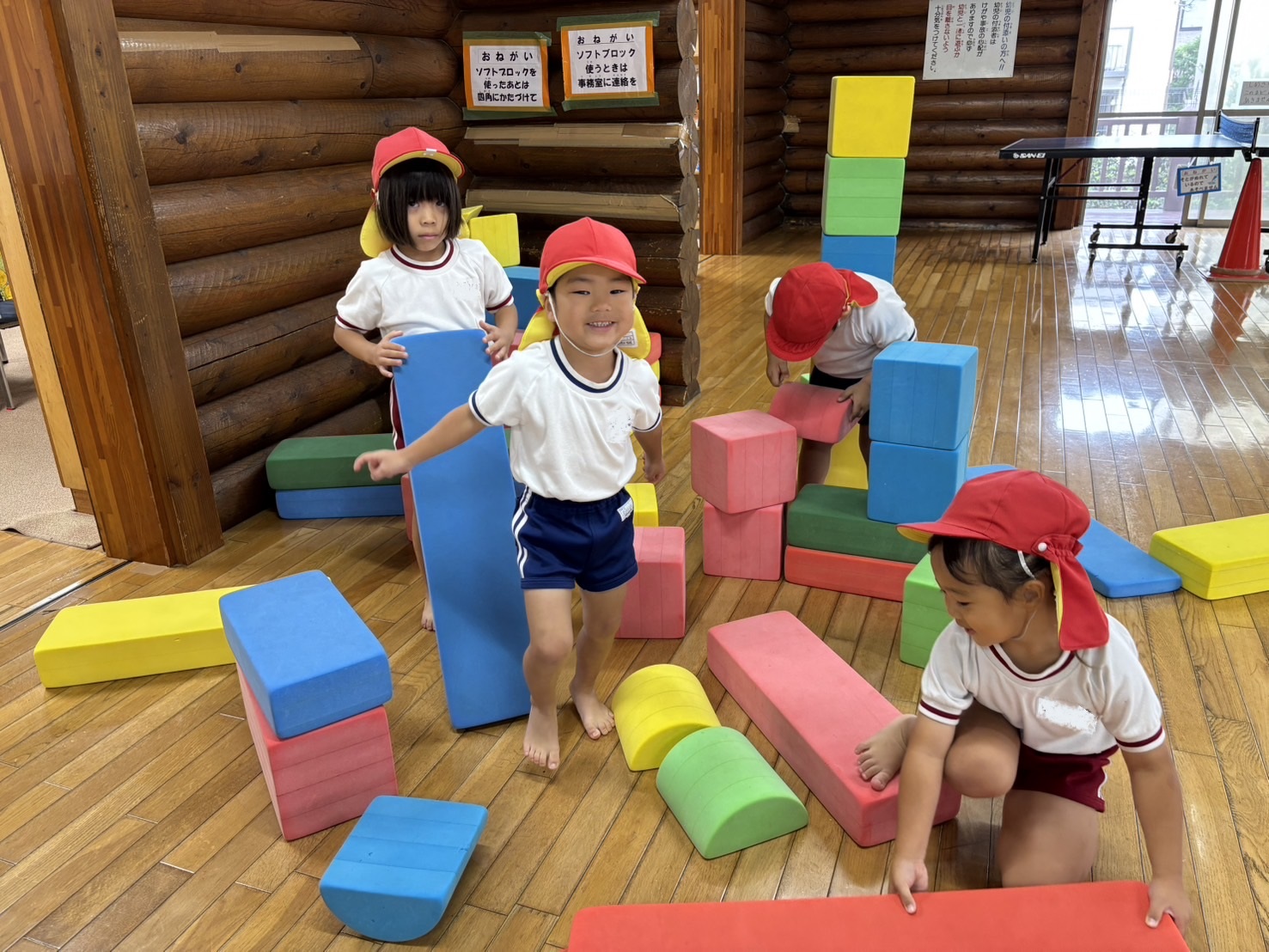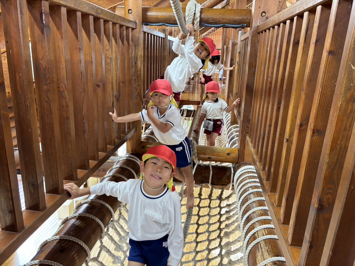 10/15 年中組☆遠足 年中組はあいにくのお天気だったので、大野子どもの家に遠足に行ってきました。出発前のバスの中から、ワクワクが止まりません☆大きなブロックでおうちを作ったり、はしごを上って屋根裏に探検に行ったり♪思いっきり遊び大満足の表情の年中組のみんなでした。