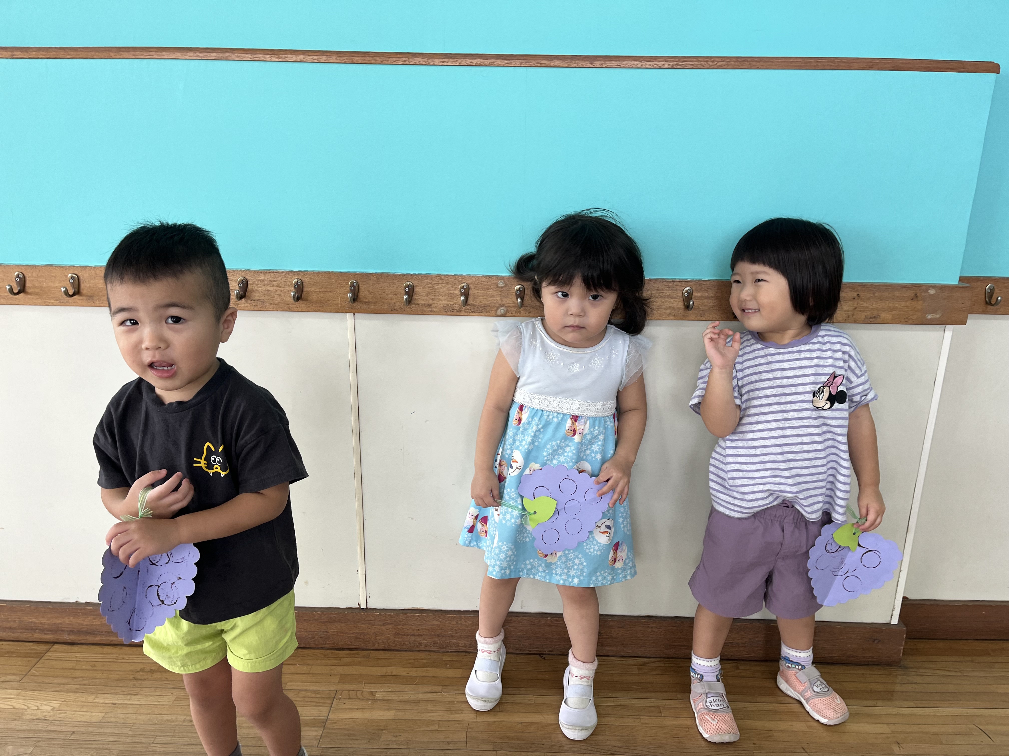 今日は絵の具を使って遊びました。ぶどうの形に切った画用紙に、ペットボトルの蓋で作ったスタンプを絵の具につけて、ポンポンと押していきます。ぶどうの実の様になり、みんなも大喜び♡最後に葉っぱをつけてできあがり♪かわいいぶどう、お家に飾ってね♡はなのこ教室も、残り1回となりました・・・みなさん是非遊びに来てくださいね♪
