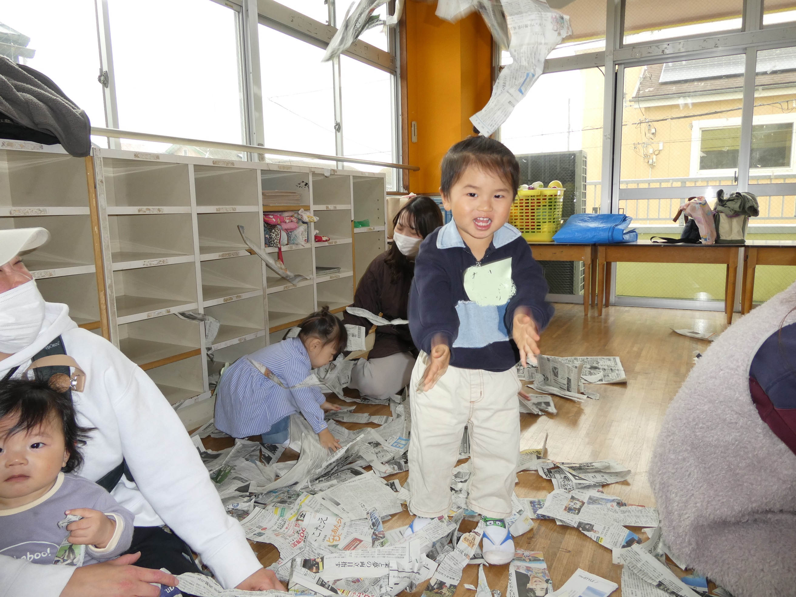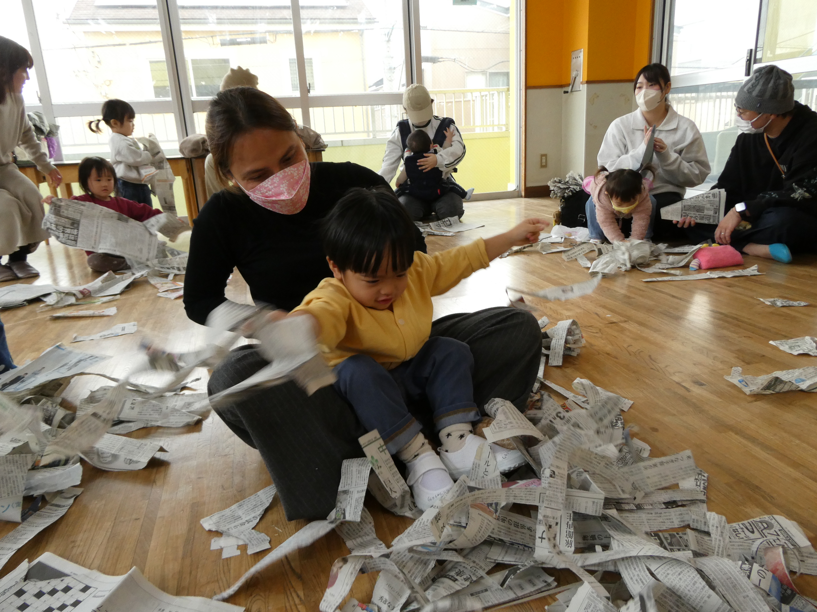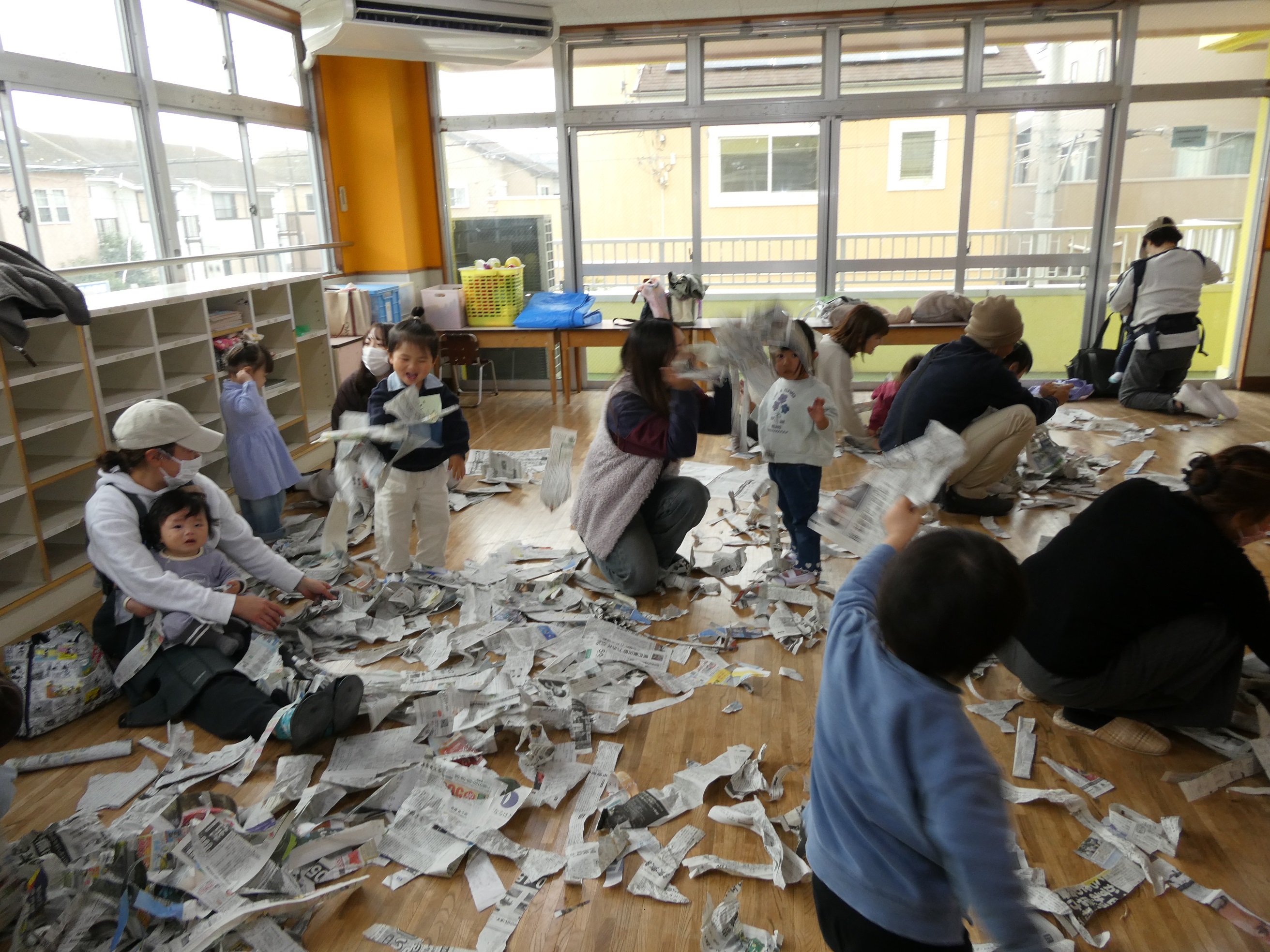 今日は新聞紙を使ってあそびました。びりびり破いて、おへやいーっぱい!新聞紙の海になりましたよ~ きゃーきゃー言いながら泳いだり投げてみたり♪最後は袋に全部詰めて、ボールを作りお家の方と投げっこやサッカー遊びを楽しみました☆お家ではなかなかできない遊びを、楽しんでもらえたようでよかったです(*’▽’)