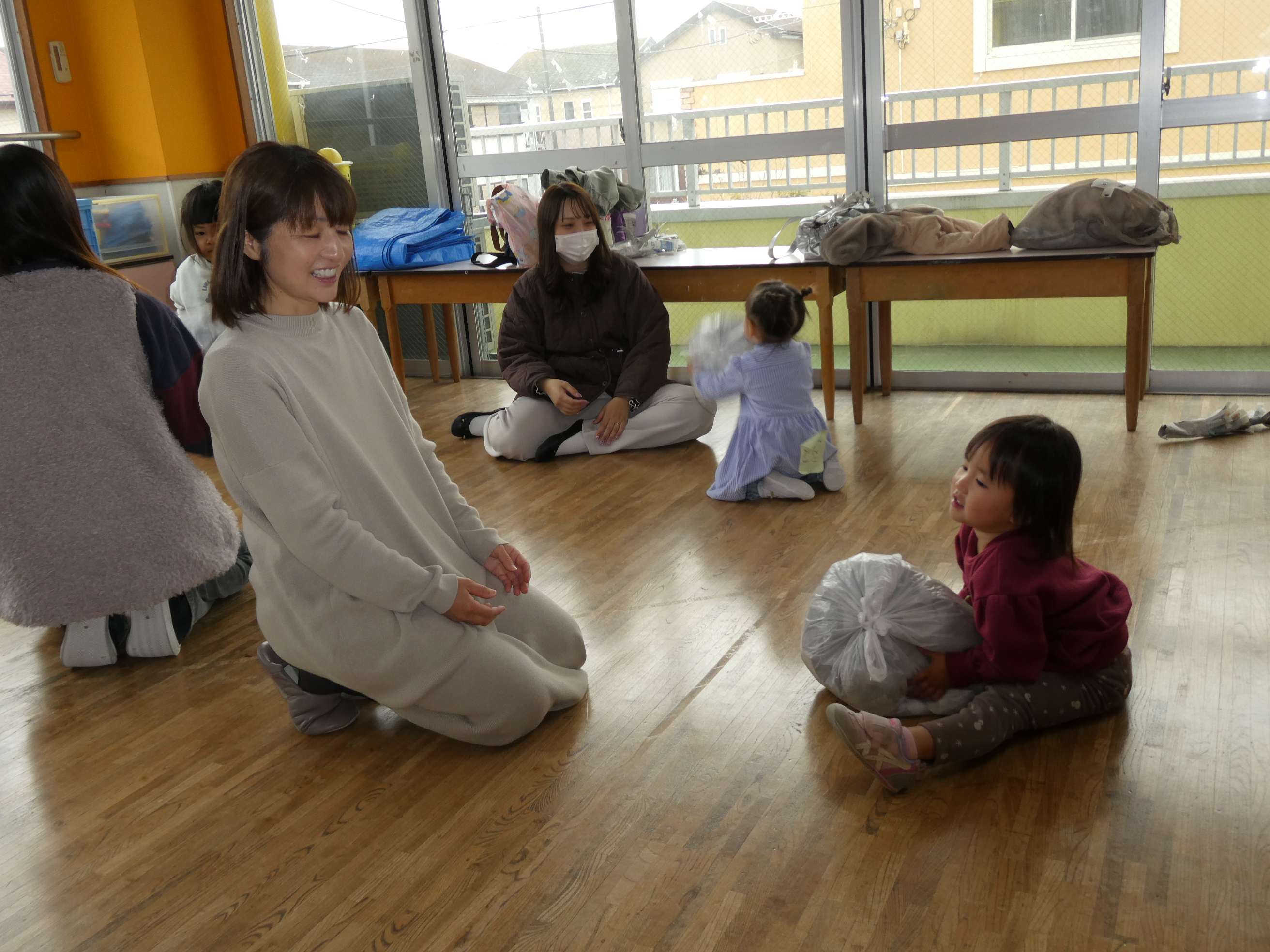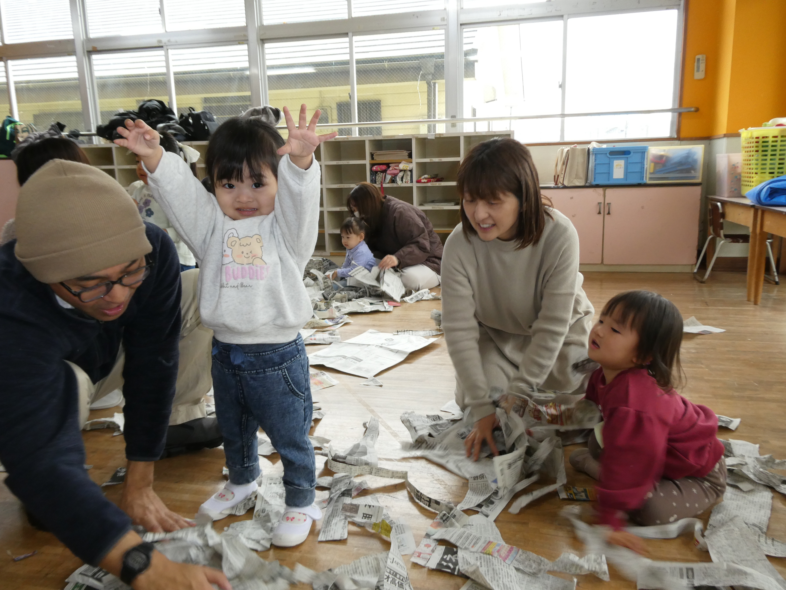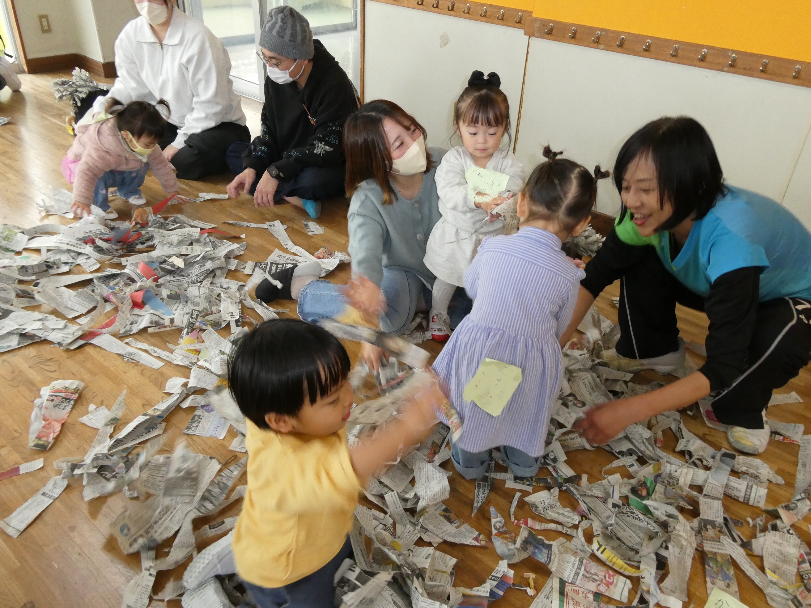 今日は新聞紙を使ってあそびました。びりびり破いて、おへやいーっぱい!新聞紙の海になりましたよ~ きゃーきゃー言いながら泳いだり投げてみたり♪最後は袋に全部詰めて、ボールを作りお家の方と投げっこやサッカー遊びを楽しみました☆お家ではなかなかできない遊びを、楽しんでもらえたようでよかったです(*’▽’)
