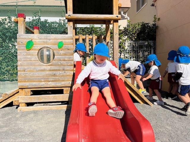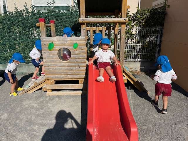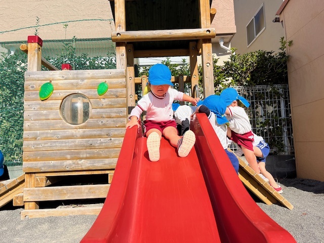 もう11月も終わりますが、ぽかぽかいいお天気で気持ちがいいですね。ポピー組のみんなもお外で遊べて嬉しそうです♪今日は、赤い滑り台の遊具でたくさん遊びました。横にはボルダリングもついていて、落ちないように一生懸命登っていましたよ!