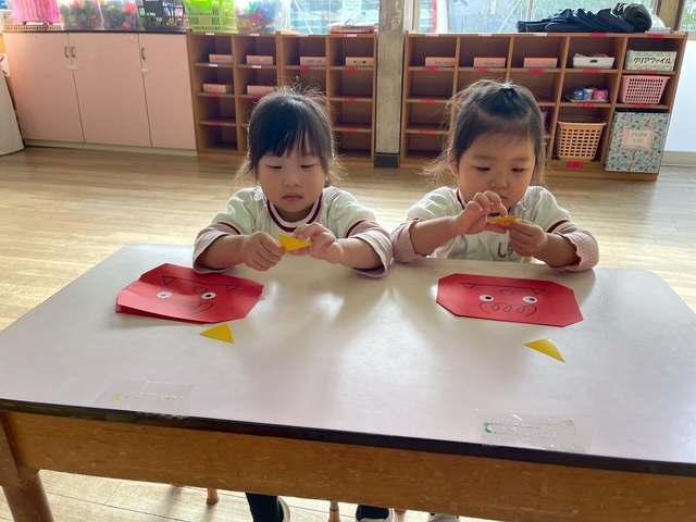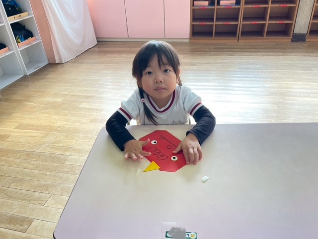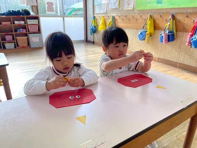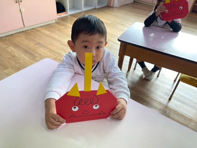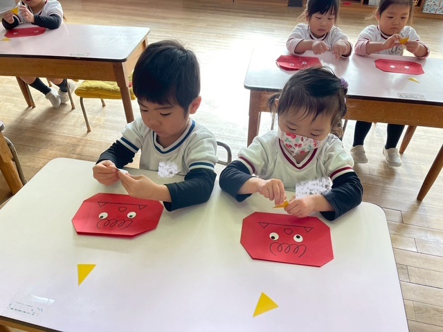 01/22 鬼バッグ制作 今日は節分に向けて、鬼のバッグの制作を行いました。目のシールを張る位置で、表情がそれぞれ違いかわいいバッグが出来上がりました♪節分では、バッグに豆をいれて悪い鬼をやっつけようね!
